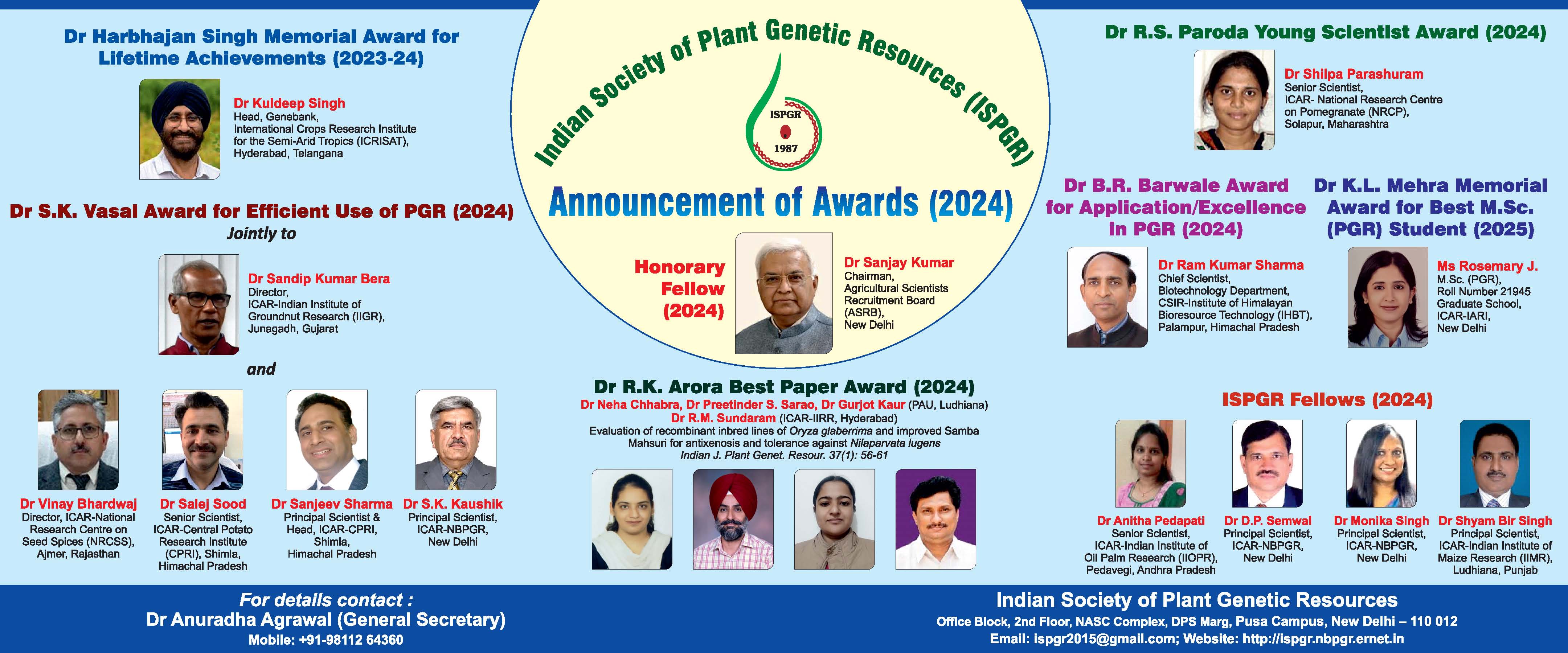 The Indian Society of Plant Genetic Resources (ISPGR) was founded in 1987 as a multidisciplinary scientific body involved in the various issues of plant genetic resources (PGR) and related fields. It currently has more than 850 members, nearly 800 of them being life members. The genesis of the society was from the initiative taken by the scientists at the National Bureau of Plant Genetic Resources (NBPGR), New Delhi, under the leadership of Dr R.S. Paroda, the then Director of NBPGR and presently Chairman, Trust for Advancement of Agricultural Sciences (TAAS).